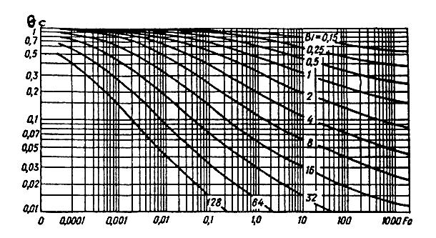 где ατ — коэффициент нестационарного теплообмена, Вт/(м2∙К). Пользоваться решениями для оценки θ и Ки в практических расчетах весьма затруднительно, поэтому решения (4.8) и (4.9) в виде номограмм приведены на рис. 4.1 и 4.2.