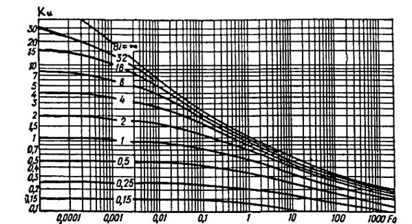 Рис. 4.2. Номограмма для определения безразмерного коэффициента нестационарного теплообмена (критерия Кирпичева) между горным массивом и рудничным воздухом
