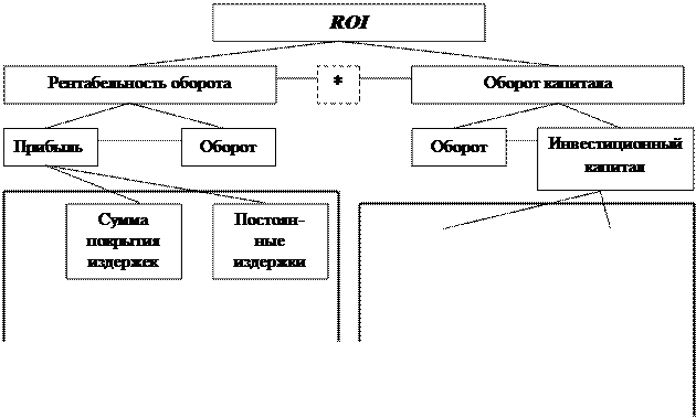 Таким образом, в рамках оперативного контроллинга решаются текущие задачи обеспечения устойчивого функционирования предприятия. Как и в стратегическом контроллинге в оперативном используется система показателей, характеризующих результаты производственно-хозяйственной деятельности предприятия. Кроме прибыли анализу подвергаются различные показатели рентабельности (приложение 2). Особую ценность представляют показатели, которые поддаются разложению на составляющие, так как благодаря им контроллеры и менеджеры могут определить первоисточник отклонения. Одним из таких показателей является рентабельность инвестиционного капитала (ROI):