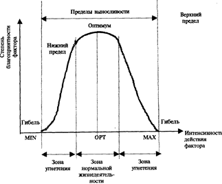 Диапазон толерантности по каждому фактору, таким образом, ограничен его минимальными и максимальными значениями, в пределах которых только и может существовать организм.