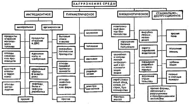 Источниками антропогенного загрязнения являются: 1) промышленные предприятия; 2) теплоэнергетический комплекс; 3) транспорт; 4) бытовые отходы; 5) отходы животноводства, а также химические вещества, вводимые человеком в экосистемы для защиты полезных продуцентов от вредителей, болезней, сорняков.