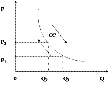 При падении уровня цен в экономике происходит рост величины СС, т.е. происходит как бы движение вверх вдоль кривой СС и наоборот.