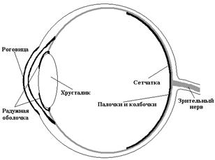 На рис. 2.1 схематически изображен глаз человека. Фоторецепторы, расположенные на поверхности сетчатки, играют роль приемников света. Хрусталик - это своеобразная линза, формирующая изображение, а радужная оболочка исполняет роль диафрагмы, регулируя количество света, пропускаемого внутрь глаза. Чувствительные клетки глаза неодинаково реагируют на волны различной длины. Интенсивность света есть мера энергии света, воздействующего на глаз, а яркость - это мера восприятия глазом этого воздействия. Интегральная кривая спектральной чувствительности глаза приведена на рис. 2.2; это стандартная кривая Международной комиссии по освещению (МКО, или CIE - Comission International de l'Eclairage).