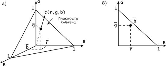 Поскольку эти координаты в сумме всегда составляют единицу, а каждая из координат лежит в диапазоне от 0 до 1, то все представленные таким образом точки пространства будут лежать в одной плоскости, причем только в треугольнике, отсекаемом от нее положительным октантом системы координат (рис. 2.5а). Ясно, что при таком представлении все множество точек этого треугольника можно описать с помощью двух координат, так как третья выражается через них посредством соотношения