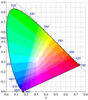 Рис. 2.6. Цветовой график МКО. На контуре указаны длины волн в нанометрах