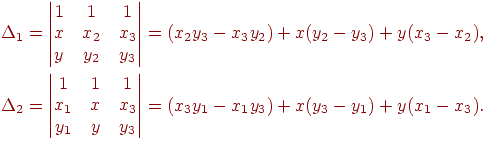 этой точки. Геометрический смысл этих координат заключается в том, что они равны отношению площадей треугольников, изображенных на рис. 3.4: