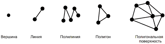 Для этих пространственных моделей используются в качестве примитивов вершины (точки в пространстве), отрезки прямых (векторы), из которых строятся полилинии, полигоны и полигональные поверхности. Главным элементом описания является вершина, все остальные являются производными. В трехмерной декартовой системе координаты вершины определяются своими координатами (x,y,z), линия задается двумя вершинами, полилиния представляет собой незамкнутую ломаную линию, полигон - замкнутую ломаную линию. Полигон моделирует плоский объект и может описывать плоскую грань объемного объекта. Несколько граней составляют этот объект в виде полигональной поверхности - многогранник или незамкнутую поверхность ("полигональная сетка").