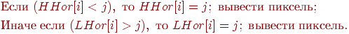 Таким образом, пиксель выводится только в том случае, если он выше верхнего или ниже нижнего горизонта, после чего его координаты уже сами становятся одним из горизонтов. А в целом алгоритм будет выглядеть так:
