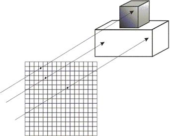 . В этом случае все световые лучи, идущие от наблюдателя, параллельны оси (рис. 6.7). Каждый луч проходит через пиксель растра до сцены. Траектория каждого луча отслеживается, чтобы определить, какие именно объекты сцены, если таковые существуют, пересекаются с данным лучом. Необходимо проверить пересечение каждого объекта сцены с каждым лучом. Если луч пересекает объект, то определяются все возможные точки пересечения луча и объекта. Можно получить большое количество пересечений, если рассматривать много объектов. Эти пересечения упорядочиваются по глубине. Пересечение с максимальным значением