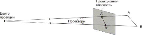 В математическом смысле проекции - это преобразования точек пространства размерности n в точки пространства размерности меньшей, чем n, или, как еще говорят, на подпространство исходного пространства. В компьютерной графике рассматриваются преимущественно проекции трехмерного пространства образа на двумерную картинную плоскость. Проекция трехмерного объекта, представленного в виде совокупности точек, строится при помощи прямых проецирующих лучей, которые называются проекторами и которые выходят из центра проекции, проходят через каждую точку объекта и, пересекая картинную плоскость, образуют проекцию.