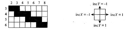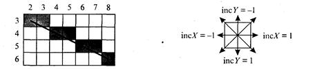 Рассмотрим пример работы приведенного выше алгоритма Брезенхэма для отрезка (х1у1 - х2у2) = (2, 3 - 8, 6). Этот алгоритм восьмисвязный, то есть при выполнении приращений координат для перехода к соседнему пикселу возможны восемь случаев (рис. 3. 30).