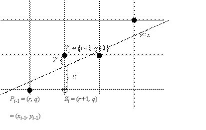 Если di ≥ 0, тогда выбирается Ti и yi = yi– 1 + 1, di+ 1 = di +2 (dy – dx). Если di < 0, тогда выбирается Si и yi = yi– 1 и di+ 1= di +2 dy.