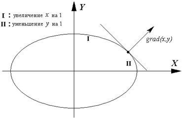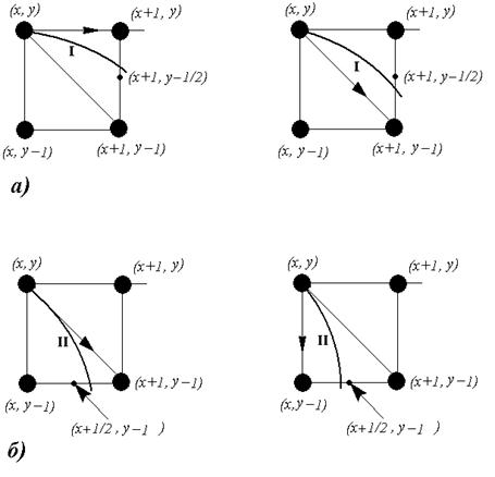 При перемещении вдоль первого участка дуги мы из каждой точки переходим либо по горизонтали, либо по диагонали, и критерий такого перехода напоминает тот, который использовался при построении растрового образа окружности. Находясь в точке