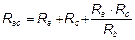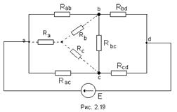 Воспользуемся способом расчета, который состоит в замене треугольника сопротивлений эквивалентной трёхлучевой звездой сопротивлений (Ra, Rb, Rc ) как показано на рис. пунктиром.