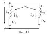 Рассмотрим теперь включение, при котором одноименные выводы присоединены к разным узлам, т. е. L1 и L2 присоединены к узлу разноименными выводами. В этом случае положительные направления напряжений взаимной индукции (выбранные сверху вниз) и тех токов, от которых они зависят, ориентированы относительно одноименных выводов неодинаково и комплексные напряжения