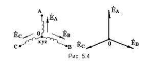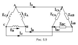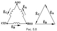 При соединении обмоток генератора треугольником конец первой обмотки генератора соединяют с началом второй, конец второй с началом третьей, конец третьей- с началом первой. (рис. 5.8)