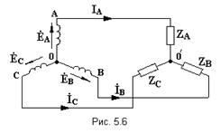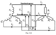 При соединении в звезду концы обмоток генератора объединяются в одну точку О, которая называется нулевой, или нейтральной.