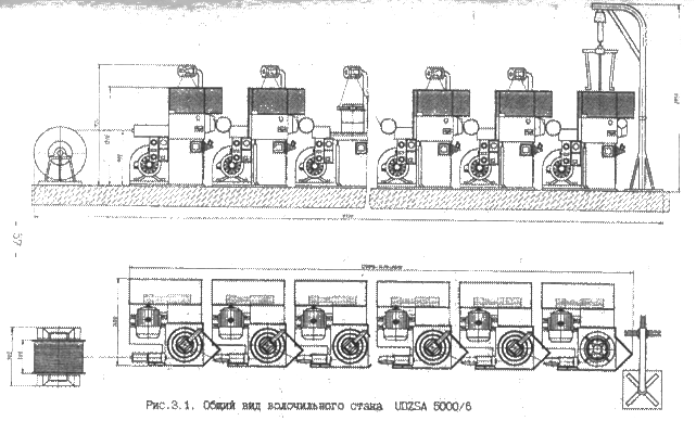 Шестикратный волочильный стан блочного типа модели UDZSA 5000/6 с максимальным усилием волочения на первом черновом блоке равным 50 кН (5000 кг), предназначен для волочения стальной углеродистой проволоки при диаметре заготовки до 12 мм. При волочении медной или алюминиевой проволоки диаметр заготовки может быть больше. Общий вид волочильного стана UDZSA 5000/6 приведен на рис.3.1.