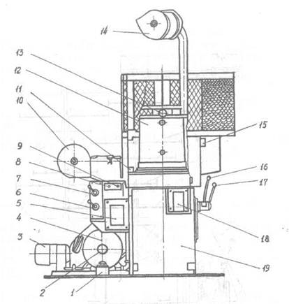 Блокирующий контакт 15 отключает главный приводной электродвигатель при открытой дверце защиты. Все механизмы смонтированы на литом корпусе 18.