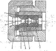 1 - рабочая твердосплавная волока; 2 - напорная твердосплавная волока; 3 - зажимная втулка; 4 - корпус волоки; 5 - гайка накидная; 6 - удерживающая шайба; 7 - предохранительная шайба