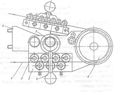 Рис.4.13.Рихтовальный аппарат: 1 - проволока, подвергающаяся рихтовке; 2 - основание для подвижных роликов; 3 - основание для неподвижных роликов; 4 - рукоятка; 5 - обводной ролик; 6 - корпус рихтователя; 7 - ось эксцентрика