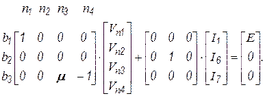 Проиллюстрируем возможности модифицированного узлового метода на том же примере, что и для табличного метод (схема рисунка 4.2). Матрица инциденций и компонентные уравнения ветвей второй группы (независимый источник напряжения