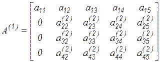 На первом этапе для приведения матрицы коэффициентов к треугольному виду необходимо путем элементарных операций, столбец за столбцом, все коэффициенты ниже диагонали преобразовать в нули. В качестве первого шага для обнуления коэффициентов первого столбца ниже диагонали вычтем последовательно из второй строки первую, умноженную на