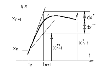 Значение функции в следующей точке вычисляется через значение функции и ее производную в предыдущей точке. Из рисунка видно, ошибка вычисления тем больше, чем больше шаг интегрирования.