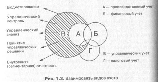 С течением времени процесс управления предприятием претерпел существенные изменения как с точки зрения постановки задач, так и с точки зрения методов их решения. Производственный учет в современных условиях не является самоцелью. Его информация необходима менеджерам для принятия оперативных производственных решений. Следовательно, бухгалтерский управленческий учет включает производственный учет. Взаимосвязь видов учета иллюстрируется на рис. 1.3.