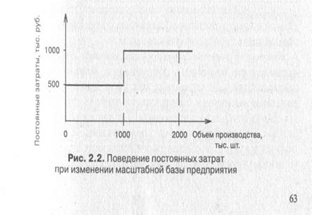 Под масштабной базой в управленческом учете понимается определенный интервал объема производства (продаж), в котором затраты ведут себя определенным образом, имеют какую-либо четко выраженную тенденцию. Например, предприятие располагает станочным парком в 10 ед. оборудования. При этом ежегодно производится 1 млн. ед. продукции. Годовая сумма амортизации по этим основным средствам составляет 500 тыс. руб. Руководство предприятия решило удвоить объем выпуска, для чего ввело в эксплуатацию 10 дополнительных станков. Масштабная база, в рамках которой амортизационные отчисления до сих пор оставались постоянными (от 0 до 1 млн. шт. изделий), изменилась. Теперь это другой интервал в объеме производства — от 1 до 2 млн. шт. изделий. Амортизационные отчисления, являющиеся по своей сути постоянными издержками, выйдут на качественно иной уровень и снова зафиксируются на значении 1 млн. руб. до следующего изменения масштабной базы. Описанная зависимость иллюстрируется рис. 2.2.