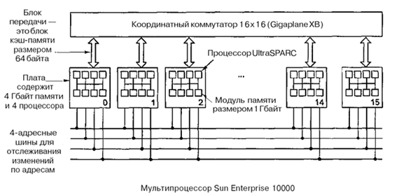 Enterprise 10000 использует 4 отслеживающие шины параллельно, плюс очень широкий координатный коммутатор для передачи данных. Ясно, что такая система преодолевает предел в 64 процессора.