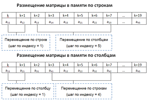 При размещении матрицы в памяти все ее элементы заносятся в ячейки с последовательными адресами, причем данные могут быть записаны строка за строкой или столбец за столбцом. С учетом такого размещения многомерных массивов в памяти вполне допустимо рассматривать их как векторы и ориентировать соответствующие вычислительные средства на обработку одномерных массивов данных (векторов).
