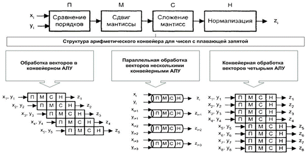 Каждый этап может быть реализован с помощью отдельной ступени конвейерного АЛУ. Очередной элемент вектора подается на вход конвейера, как только освобождается первая ступень. Ясно, что такой вариант вполне годится для обработки векторов.