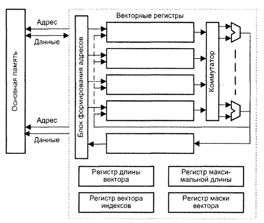 · Векторные регистры для хранения векторов-операндов, которые представляют собой совокупность скалярных регистров, объединенных в очередь типа FIFO, способную хранить 50-100 чисел с плавающей запятой.