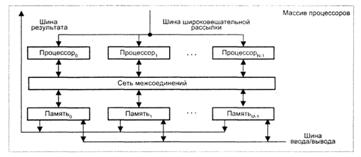 Рассматривая массив процессоров, следует учитывать, что для хранения множественных наборов данных в нем, помимо множества процессоров, должно присутствовать и множество модулей памяти. Кроме того, в массиве должна быть реализована сеть взаимосвязей, как между процессорами, так и между процессорами и модулями памяти.