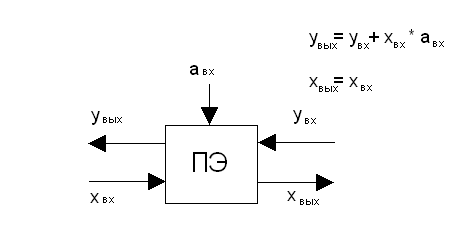 Значение увх, поступающее на вход ПЭ, суммируется с произведением входных значений xвх и авх. Результат выходит из ПЭ как увых. 3начение хвх, кроме того, для возможного последующего использования остальной частью массива транслируется через ПЭ без изменений и покидает его в виде xвых.