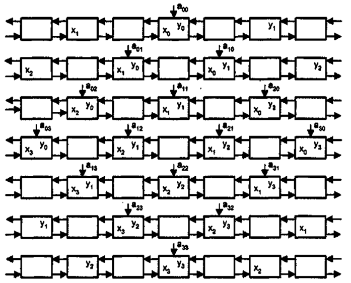 Рассмотрим в качестве примера систолическую структуру, выполняющую процесс векторного умножения матриц. В основе схемы лежит ритмическое прохождение двух потоков данных xi и уj навстречу друг другу. Последовательные элементы каждого потока разделены одним тактовым периодом, чтобы любой из них мог встретиться с любым элементом встречного потока. Вычисления выполняются параллельно в процессорных элементах, каждый из которых реализует один шаг в операции вычисления скалярного произведения (IPS, Inner Product Step) и носит название IPS-элемента.