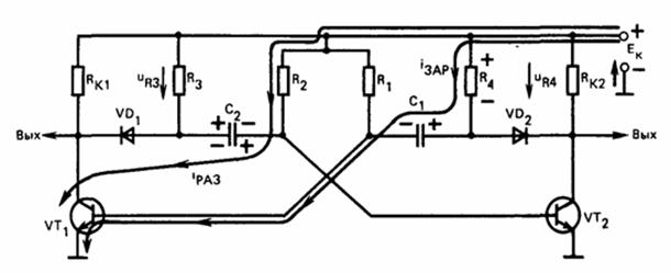 В этом мультивибраторе зарядный ток конденсатора времязадающих цепей замыкается через резисторы R3 и R4. При этом на указанных резисторах возникают напряжения, которые закрывают соответствующий диод VD1, VD2. Закрытый диод отключает зарядную цепь конденсатора от коллектора транзистора, напряжение на коллекторе достаточно быстро устанавливается на уровне Ек. Конденсаторы заряжаются по той же цепи, что и мультивибратор на рис. 10, так как в это время соответствующий диод открыт, его сопротивление мало и практически не влияет на длительность выходных импульсов. На рис. 11 показано состояние мультивибратора, в котором транзистор VT1 открыт, а VD2 закрыт. В этом состоянии диод VD2 закрыт напряжением с резистора R4, а диод VD1 открыт. Конденсатор C1 заряжается током, протекающим через резистор R4, а конденсатор С2 разряжается через открытый диод VD1.