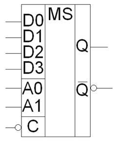 Мультиплексор является устройством, которое осуществляет коммутацию одного из нескольких информационных входных сигналов на выход в соответствии с заданным кодом на входах управления. Мультиплексор имеет несколько информационных входов (D0, D1,...),, входы управления(A0, A1,...) и один выход Q. На рис. 25, а показано символическое изображение типичного мультиплексора с четырьмя информационными входами и входом синхронизации С.