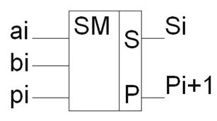 Из рассмотренного ранее принципа сложения многоразрядных двоичных чисел следует, что в каждом из разрядов производятся однотипные действия: определяется цифра суммы путем сложения по модулю 2 цифр слагаемых и поступающего в данный разряд переноса и формируется перенос, передаваемый в следующий разряд. Эти действия реализуются одноразрядным двоичным сумматором. Символическое изображение такого сумматора показано на рис. 27, а. Он имеет три входа для подачи цифр разрядов слагаемых ai, bi и переноса рi; на выходах формируются сумма si, и перенос pi + 1,i предназначенный для передачи в следующий разряд.
