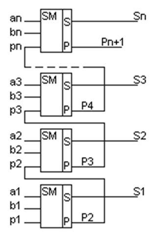 сумматора, выход pi+1 которого соединен с входом pi через элемент задержки, параметры которого согласованы со скоростью поступления разрядов слагаемых на входы сумматора. Операция суммирования во всех разрядах слагаемых осуществляется с помощью одного и того же одноразрядного сумматора, но последовательно во времени, начиная с младших разрядов. Такое построение сумматора возможно за счет того, что слагаемые поступают в последовательной форме.