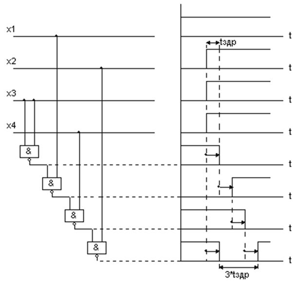 Рассмотрим КЦУ представленную на рис. 30, а. Входной сигнал изменяется с кода 1000 на код 1111. Задержка в каждом логическом элементе tзад. Структурная схема КЦУ и временные диаграммы для данного примера приведены на рис. 30, б. В данном случае на выходе КЦУ при изменении кода входного сигнала 1000 на код 1111 кратковременно устанавливается нулевое значение (на время 3 * tздр), хотя по условиям работы выходное значение должно было сохраниться на единичном уровне.