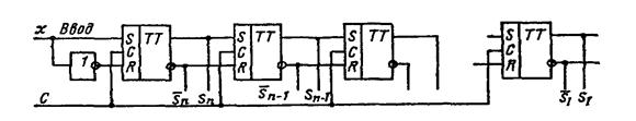 В регистре сдвига вправо первый разряд вводимого числа x1 подается на вход одного, крайнего слева, разряда регистра Sn и вводится в него при поступлении первого сигнала синхронизации С. С приходом следующего сигнала синхронизации значение хi с выхода разряда Sn вводится в разряд Sn-1 а в разряд Sn поступает х2. В каждом такте производится сдвиг поступающей информации на один разряд вправо. После n сигналов синхронизации весь регистр оказывается заполненным разрядами числа X, и первый разряд числа x1 появится на выходе S1 Если подать последовательность из n сигналов синхронизации и на вход разряда Sn податьх=0,то из регистра будет выводиться число Х через выход S1 и в конце вывода регистр будет освобожден от хранения числа X. Регистры сдвига реализуются на D-триггерах (рис. 47) или RS-триггерах (рис. 48). В последней схеме для ввода информации в первый разряд включается схема инвертора.
