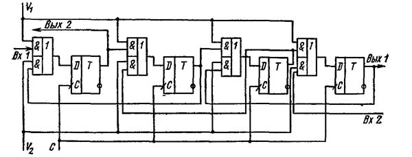 Комбинируя схемы сдвига вправо и влево и используя управляющие сигналы, можно построить регистр сдвига в обоих направлениях. Такой регистр называется реверсивным (рис. 50). При подаче разрешающего сигнала на управляющий вход V1 включается схема сдвига вправо. Реверсивный регистр при этом превращается в регистр сдвига вправо. При подаче разрешающего сигнала на управляющий вход V2 включается схема сдвига влево. Реверсивный регистр превращается в регистр сдвига влево.