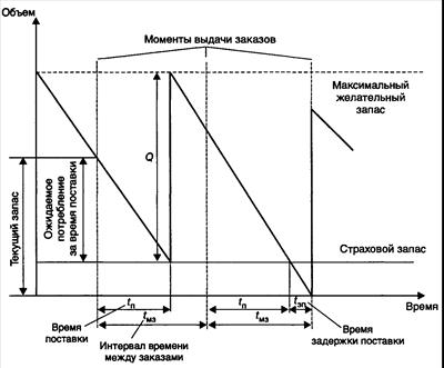 где Qi – размер заказа i, единиц; МЖЗ – максимальный желательный запас, единиц; ZTi – уровень текущего запаса при выдаче заказа i, единиц; Zti – объем запаса в пути, не полученного к моменту выдачи заказа i, единиц; ОП – ожидаемое потребление за время выполнения заказа, единиц.