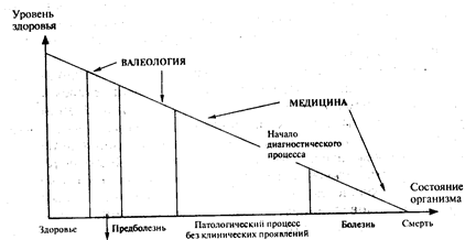 Количественный подход к оценке здоровья в методологическом плане предполагает ту посылку, что данный человек в каждый период времени имеет определенную величину функциональных возможностей, позволяющую ему реализовать свою генетическую программу, то есть величину здоровья (впрочем, как и уже имеющихся нарушений – болезни). Поэтому человек должен иметь четкую цель – увеличить количество здоровья и уменьшить количество болезни. А это означает, что, в каком бы состоянии человек ни находился, у него определенное количество здоровья все-таки есть (даже в состоянии клинической смерти). Возможность контролировать динамику изменения количества здоровья выгодно отличает такой подход, так как ориентирует человека (и не только явно больного, но и считающегося здоровым) на постоянное стремление к увеличению количества здоровья. Принципиально здесь и то, что в этом случае данный человек не сравнивается с другими, а лишь с самим собой: сегодня у него должно быть здоровья больше, чем вчера. Именно с этих позиций следует оценивать роль валеологии и медицины в обеспечении и восстановлении здоровья человека в зависимости от того уровня здоровья, в котором он в настоящее время находится (см. рисунок).