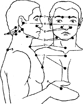 Эффективным для активизации иммунитета оказывается и точечный массаж. При этом осуществляется акупрессура девяти одиночных или симметричных биологически активных точек (см. рисунок). Важно, что при этом не только стимулируется иммунитет, но и оказывается нормализующее влияние на деятельность различных органов и функциональных систем. Хороший результат дает и точечный массаж в области тех областей тела, которые являются «входными воротами» инфекции: верхних дыхательных путей, глаз, рта, носа и др. Для активизации иммунитета в целях предупреждения простуд каждую точку следует массировать 9–10 раз в одну и столько же в другую сторону 2–3 раза в день.