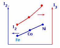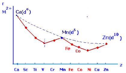 б). Почему радиусы Fe(II), Co(II), Ni(II), Cu(II) меньше прогнозируемых (пунктир)? – Из-за эффекта ЭСКП: d-электроны располагаются на t2g уровнях, экранировка металлических ионов лигандами уменьшается, их притяжение увеличивается и радиусы именьшаются.