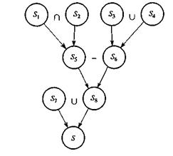 Для редактирования тела необходима информация о последовательности и способах его построения, поэтому в модель тела включают еще и дерево построения тела. В дереве построения хранится последовательность операций, выполнение которых привело к получению тела (Рис. 7.5). Результирующее тело находится в корне дерева, а его ветви начинаются в простых телах. В узлах находятся тела. Дерево имеет несколько ярусов. Операции обозначены соответствующими знаками и выполняются между телами одного яруса.