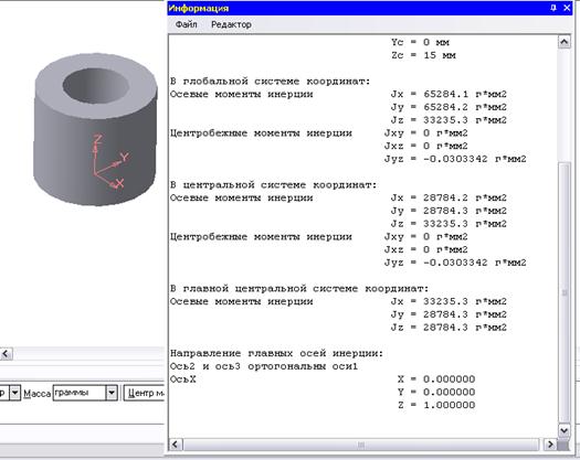 Как отмечалось выше, твердотельное моделирование рассматривает тело как сплошную среду, а не как пустой объем, ограниченный поверхностями. В этом состоит принципиальное отличие твердотельных моделей от поверхностных. Для твердотельной модели становится возможным определение ее основных физических характеристик "виртуально", без изготовления прототипа. Для твердотельной модели всегда известны ее объем и площадь поверхности. Задав свойства материала (плотность), можно с высокой точностью определить массу будущей детали, ее моменты инерции относительно координатных осей и иные механические характеристики (Рис. 7.12).